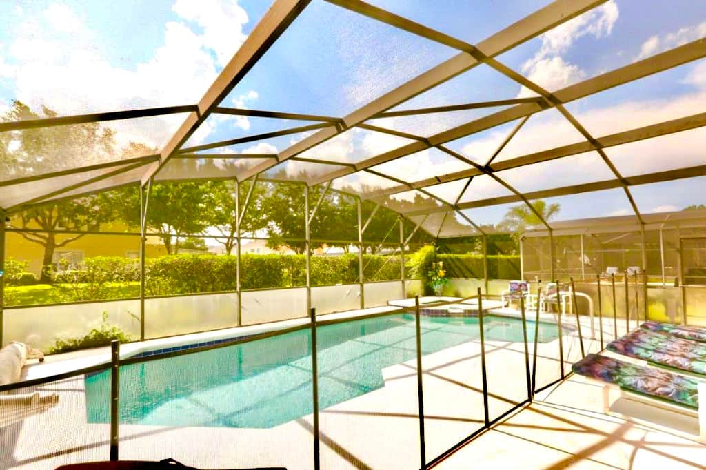 Outside you have your own private pool and spa area with lots of seating for relaxing. The pool can be heated if required. The covered lanai space is ideal for al fresco dining and for escaping from the Florida sun. There is a child safety fence if required and a “Florida screen” and hedge for your privacy.